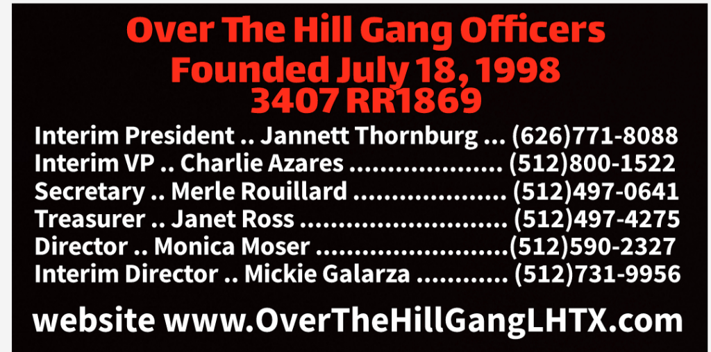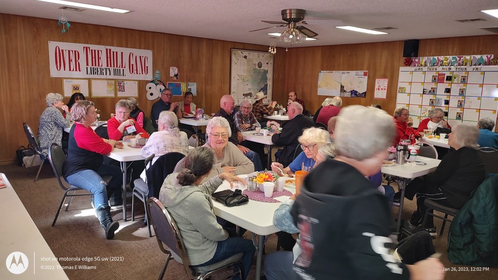 Over The Hill Gang Self-funded Senior Center 3407 Ranch Road 1869 Liberty Hill Texas (behind Parker's Corner) Recreation, Socialization, and Education for seniors 50+.