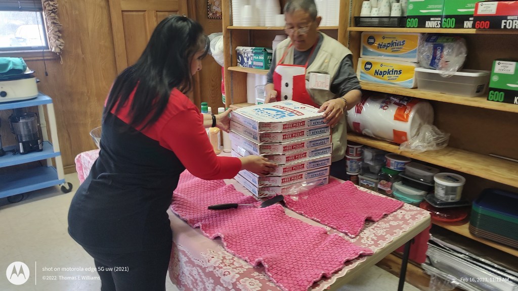 Our President (Jannett) and Vice President (Charlie) sorting pizzas for lunch.