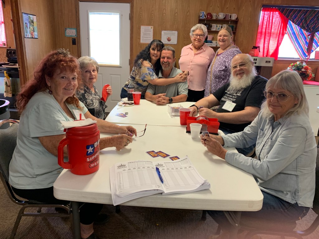 Mr. Tom and Ms. Margie waiting to play Five Crowns, while Ms. Gayle and Ms. Anna play a game of Scrabble and Gary S. sitting watching it all.