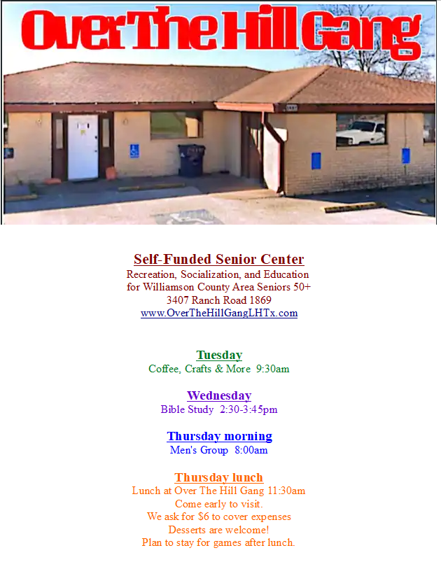 April 20th will be History of Liberty Hill with Gary Spivey, we start at 10:30. Come join us it is very educational and interesting. We will be having a History lesson every 3rd Thursday of each month.