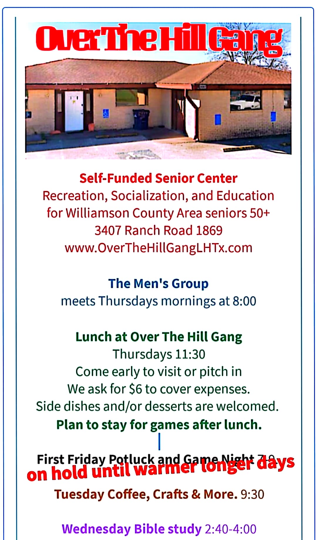 Over The Hill Gang Self-funded Senior Center 3407 Ranch Road 1869 Liberty Hill Texas (behind Parker's Corner) Recreation, Socialization, and Education for seniors 50+.